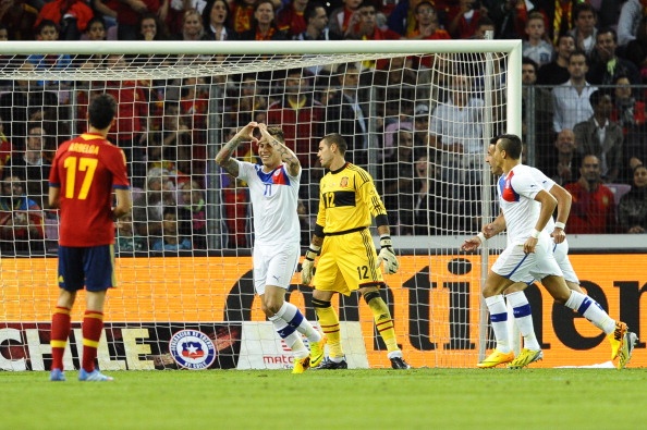Tuy nhiên, Chile đã chứng tỏ họ không dễ bị bắt nạt như những lần chạm trán trước. Chỉ sau 5 phút bóng lăn, tiền đạo thuộc biên chế Napoli Eduardo Vargas đã giúp đội bóng Nam Mỹ vượt lên dẫn trước. Trong một pha tấn công trung lộ, Gonzalo Jara bất ngờ chọc khe thông minh để Vargas băng xuống đánh bại Valdes ở thế đối mặt.Sớm bị dội gáo nước lạnh, các học trò của HLV Del Bosque có phần choáng váng. Phải mất tới gần 20 phút sau họ mới bình tĩnh trở lại. Theo đó, những pha lên bóng nguy hiểm thường thấy bắt đầu được chiến binh La Roja tung ra về phía khung thành của Bravo. Phút 37, Pedro tung ra cú treo bóng rất thuận lợi từ cánh phải, tạo điều kiện để Soldado băng vào đánh đầu quân bình tỷ số 1-1 cho Tây Ban Nha.