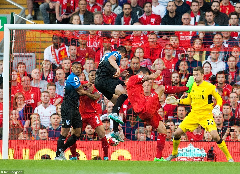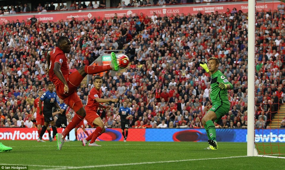 | Từ quả tạt bên cánh trái của Jordan Henderson, Benteke lao vào đệm bóng cận thành tung lưới Bournemouth ở phút 26. |