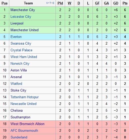| Bảng xếp hạng Ngoại hạng Anh sau vòng 2 Premier League. Bốn đội toàn thắng đến lúc này gồm Man City, Leicester City, Liverpool và M.U. |