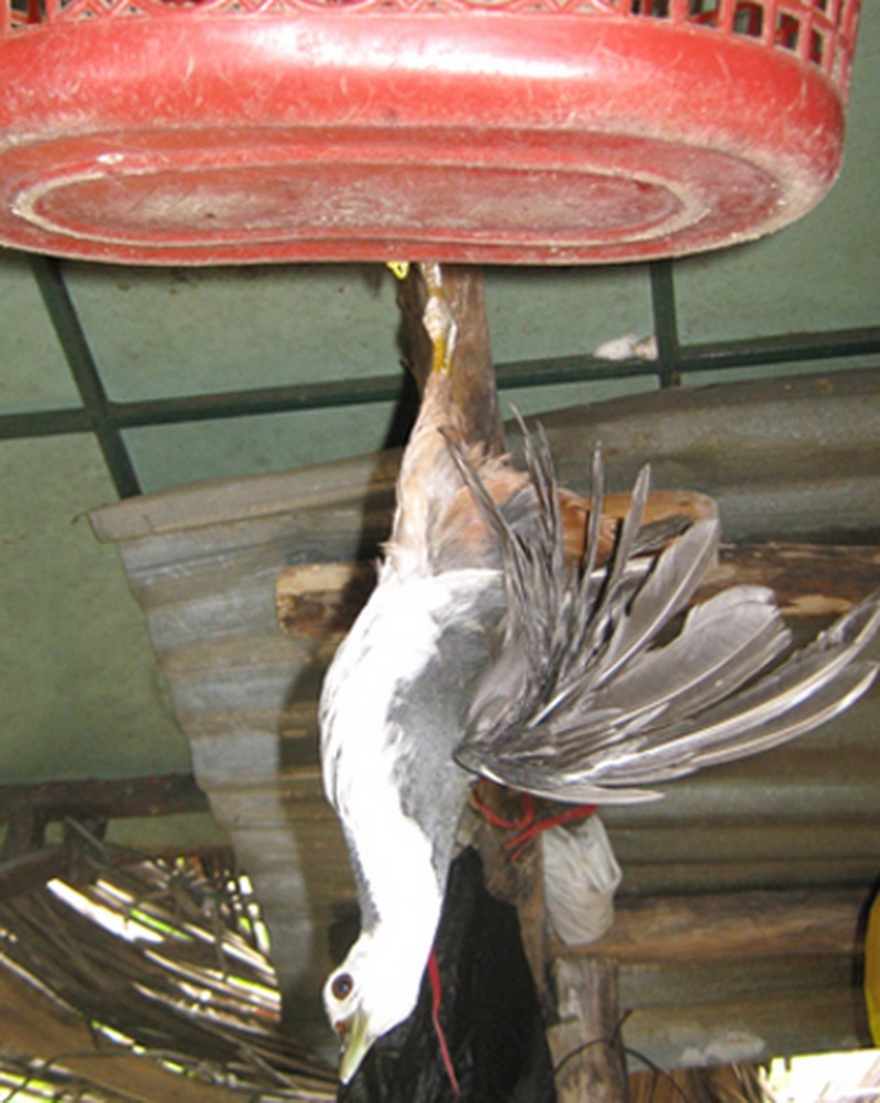 Một người đang đứng canh gần đó thấy vậy tiến đến dùng đèn pin rọi luồn tay vào bắt gọn. Túm hai chân chim, họ lấy dây thun trong túi áo ra quấn chặt rồi nhổ vài sợi lông cánh sau đó bỏ vài bao tải đeo bên hông.
