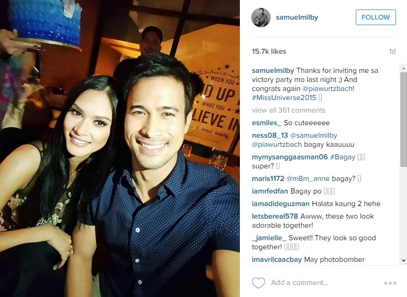 Trang ABS-CBN mới đây tiết lộ, Hoa hậu Hoàn vũ thế giới 2015 Pia Wurtzbach đang hẹn hò với ca sĩ kiêm diễn viên điển trai Sam Milby. Một nguồn tin tiết lộ, họ từng là cặp đôi trong quá khứ nhưng không thể tiến xa hơn vì công việc bận rộn. Nhưng sau khi Pia trở về quê nhà Philippines với vương miện Hoa hậu Hoàn vũ thế giới, cả hai một lần nữa bị nghi vấn tái hợp. Hôm 28/1, Sam cũng tham gia sự kiện ăn mừng Pia trở về nước và hát tặng cô.