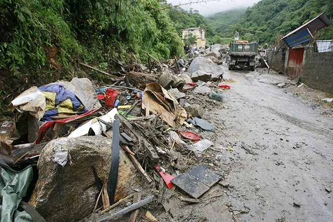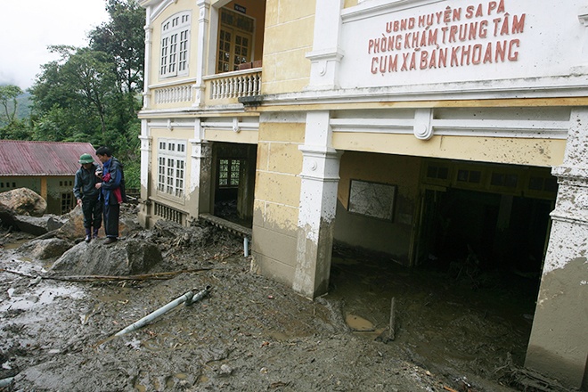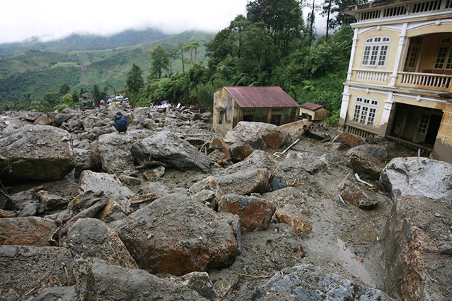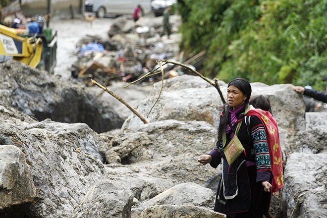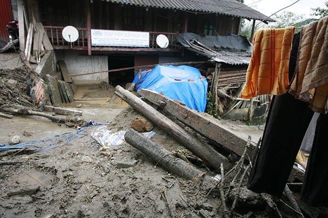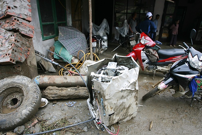 | Người dân thất thần nhìn lại hậu quả của vụ lũ quét. |