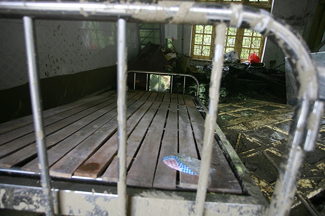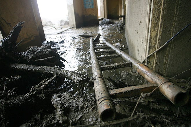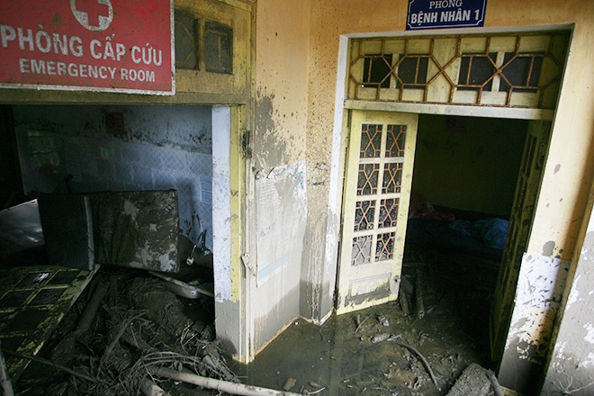 | Phòng cấp cứu, bệnh nhân đồ đạc ngổn ngang cùng đất đá và bùn nhão. |