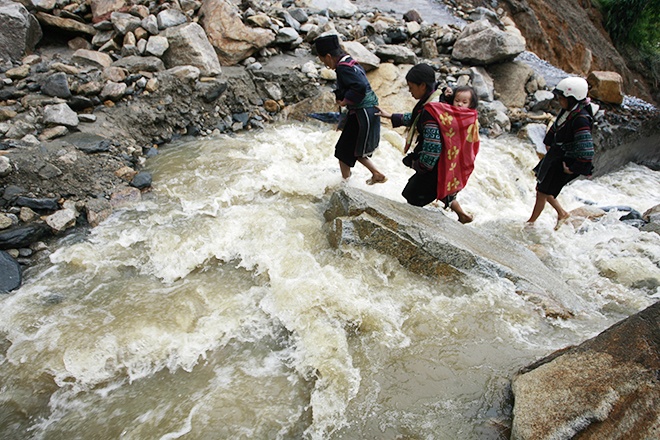 | Con suối chảy qua khu vực chảy xiết, cắt đôi con đường đi lại của người dân. |