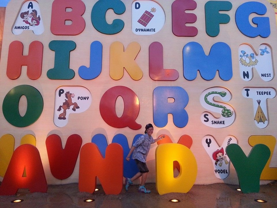 | Đức Huy lưu lại những khung hình đẹp từ 1 góc trang trí bảng 24 chữ cái ngẫu hứng từ bộ phim hoạt hình Toy Story. Đây là khu vui chơi độc đáo mới mở tại Disneyland Hong Kong, mang đến những trải nghiệm khó quên tại các gian trò chơi trong sân sau của Andy. |