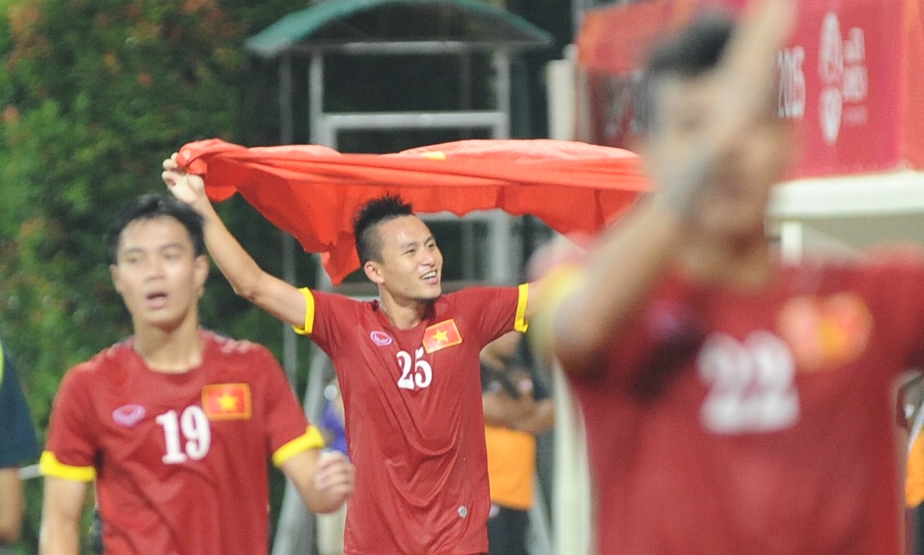 | Huy Toàn cũng không phải ngoại lệ. Chân sút của CLB SHB Đà Nẵng tỏ rõ niềm hạnh phúc. Anh là người nâng tỷ số lên 3-0 cho U23 Việt Nam sau cú sút penalty chính xác ở phút 47. |