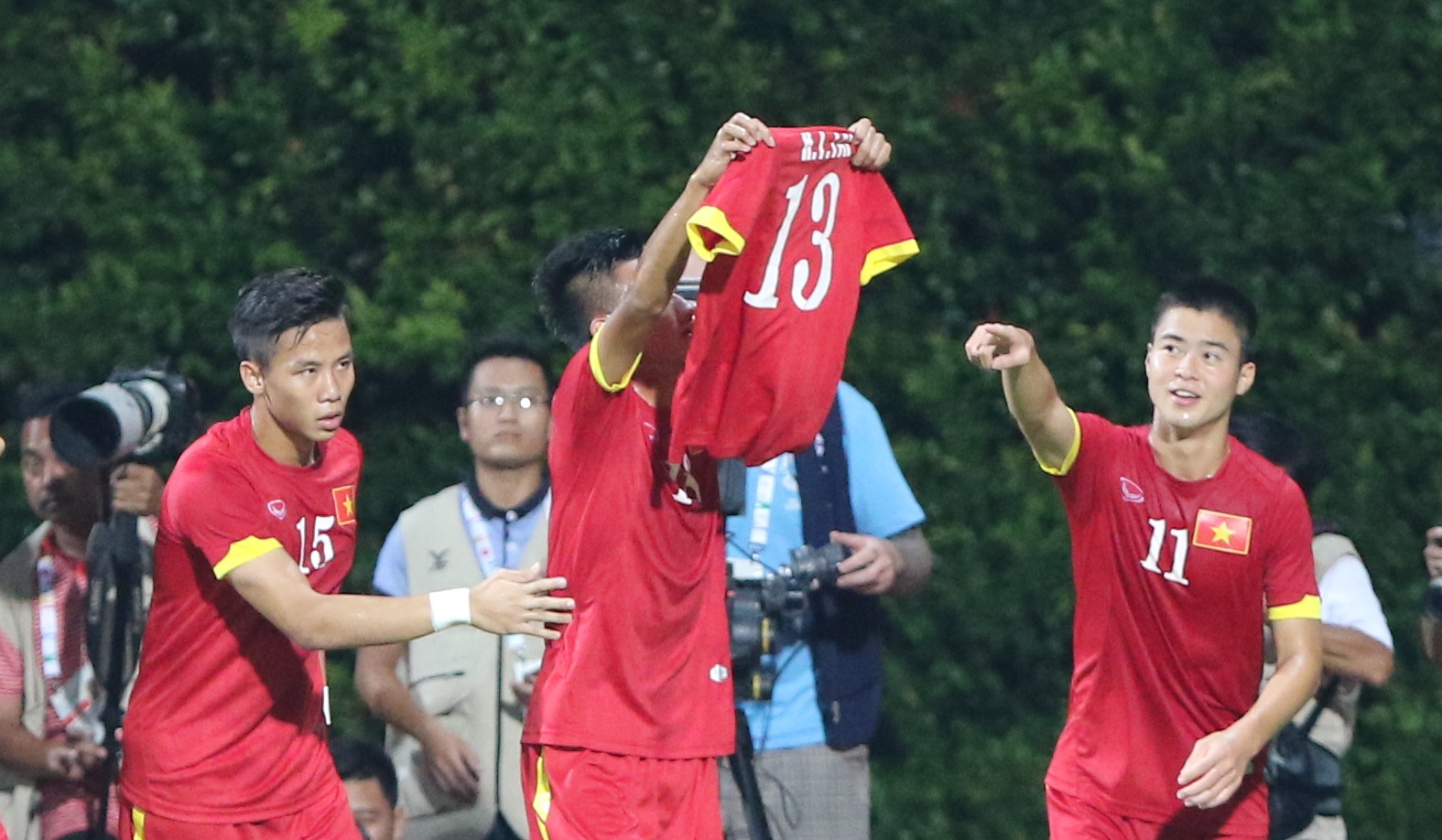 | Khi U23 Việt Nam có bàn mở tỷ số vào lưới U23 Malaysia, Quế Ngọc Hải cầm chiếc áo số 13 của Tấn Tài chạy tới ăn mừng cùng đồng đội. Các học trò của HLV Miura còn ghi thêm 4 bàn nữa để giành chiến thắng chung cuôc 5-1, đó là món quà vô giá tặng hậu vệ Tấn Tài bị rạn xương bàn chân và phải sớm nói lời chia tay SEA Games 28. |