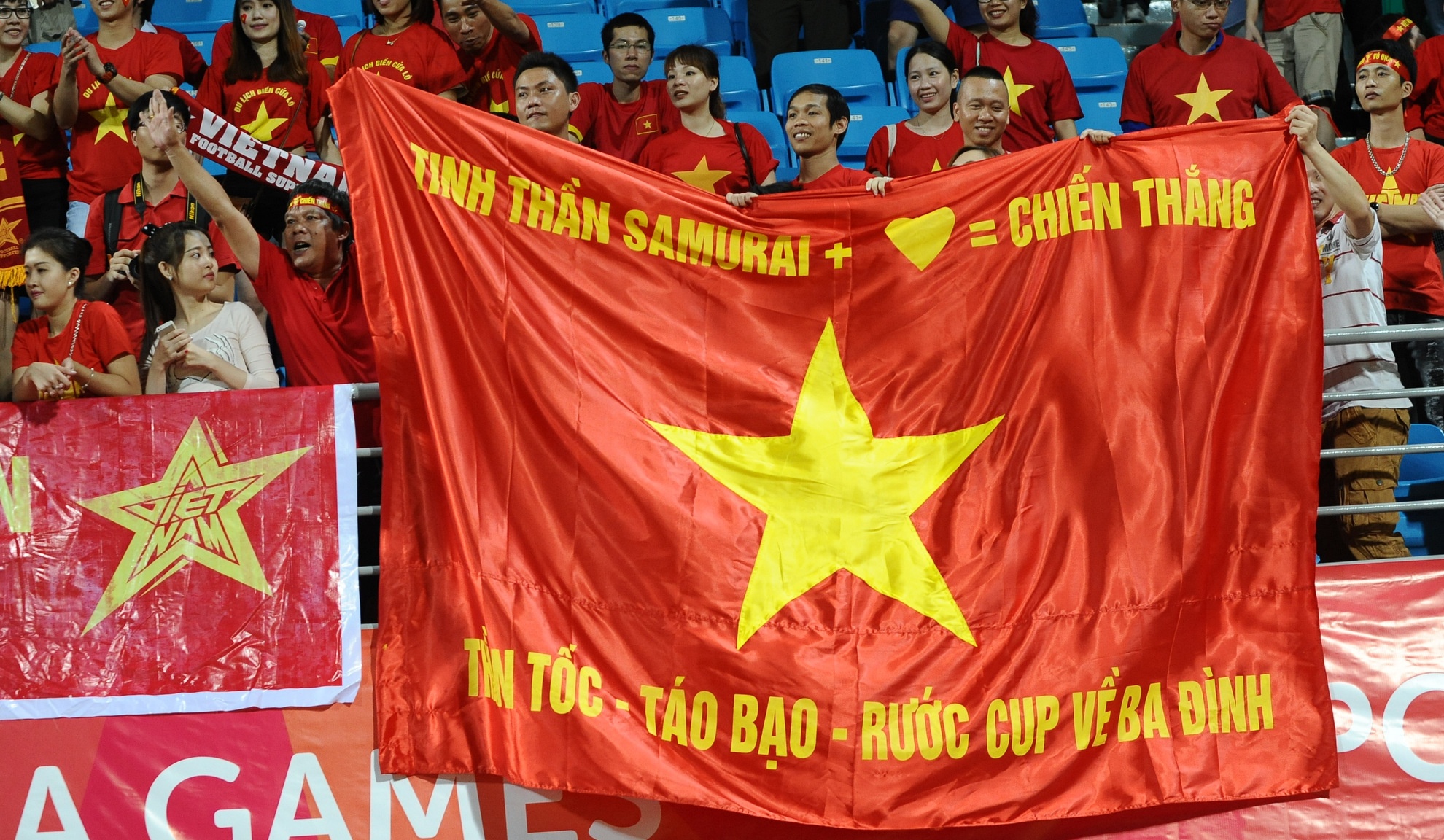 | Tiền vệ Hữu Dũng nhận băng rôn từ người hâm mộ Việt Nam có mặt trên sân Bishan. Cầu thủ của CLB Thanh Hóa thi đấu rất năng nổ ở hàng tiền vệ. Anh phải nhận thẻ vàng ở phút 38 sau pha vào bóng quyết liệt với cầu thủ U23 Malaysia. |