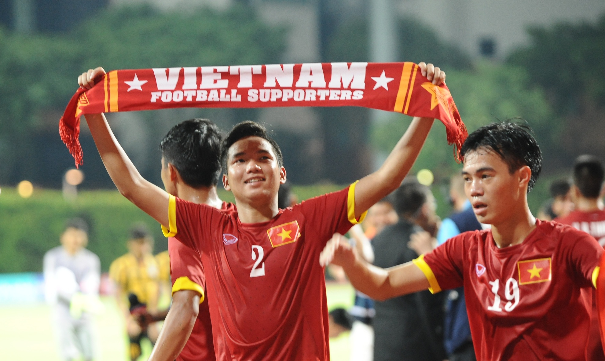 | Tiền đạo của HAGL cũng không kìm được cảm xúc sau trận thắng thuyết phục U23 Malaysia. Văn Toàn lấy cờ tổ quốc thấm những giọt nước mắt hạnh phúc. Trong trận đấu này, Toàn vào sân từ băng ghế dự bị. Anh là người ghi bàn ấn định chiến thắng 5-1 cho U23 Việt Nam với cú tâng bóng kỹ thuật. |