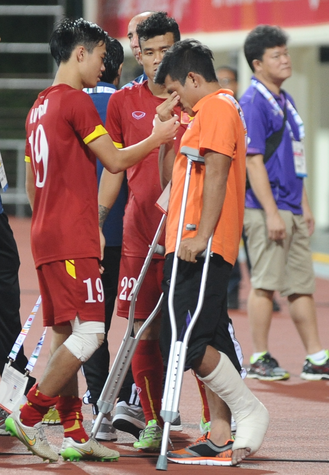 Huỳnh Tấn Tài không giữ được giọt nước mắt hạnh phúc và sự tiếc nuối vì không thể tham dự trận đại thắng 5-1 của U23 Việt Nam trước U23 Malaysia tại lượt trận thứ 2 bảng B.