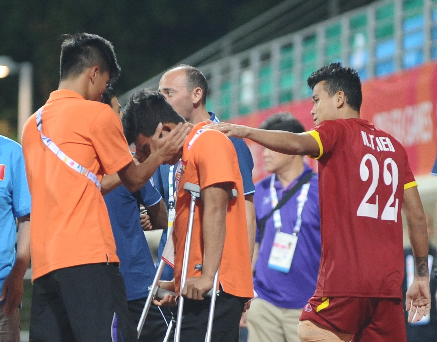 | Tiền đạo Văn Toàn động viên Tấn Tài khi hậu vệ gốc Long An không cầm được nước mắt vì xúc động. Sau khi dự khán trận đấu với U23 Malaysia, ngày mai (3/6), Tấn Tài sẽ chia tay các đồng đội để về nước tiếp tục điều trị chấn thương. |