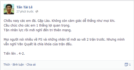 Trên trang mạng xã hội cá nhân của mình, anh chia sẻ: “Chiều nay các em đá. Gặp Lào. Không còn cảm giác dễ thắng như mọi khi. Cầu chúc cho các em 1 thắng lợi quan trọng.