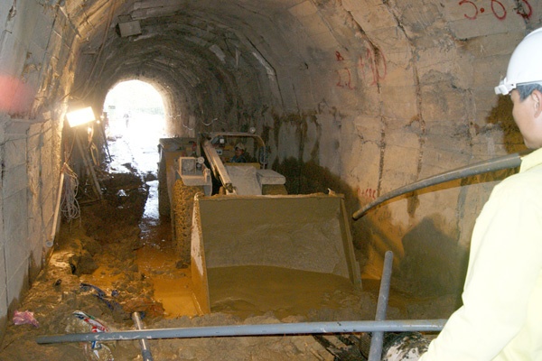 | Chiều 20/12, những công nhân của Cty Cổ phần Sông Đà 10 (đơn vị thi công đường hầm này) đang thu dọn hiện trường. Phần bùn đất từ đoạn hầm các công nhân mắc kẹt chảy ra vẫn đang được máy xúc đưa ra ngoài. |
