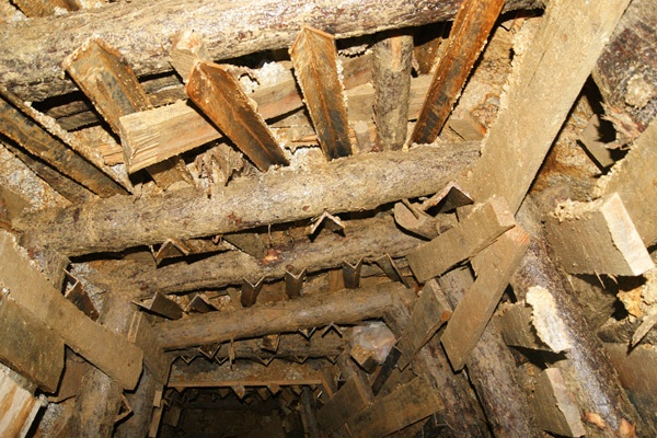 | Thanh gỗ ngang chống mái hầm ngoài được chống đỡ bởi 2 cọc chắc. Hai bên còn có những thanh sắt dài đóng vào lòng đất đỡ lực. |