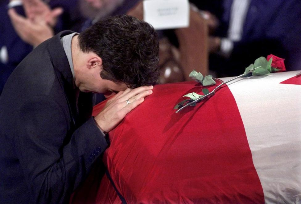 Justin đau buồn bên cạnh quan tài cha trong tang lễ cấp nhà nước tháng 10/2000. Pierre Trudeau là một trong những thủ tướng nổi tiếng nhất của đất nước Canada.