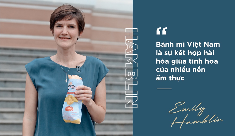 Emily Hamblin mặc áo màu xanh cổ vịt đơn giản cho buổi ghi hình ngoài trời với Zing. Bà đề nghị tự chọn và mua một ổ bánh mì thịt, như cơ hội để giao tiếp với người dân TP.HCM bằng vốn tiếng Việt mới học hơn 3 tháng.