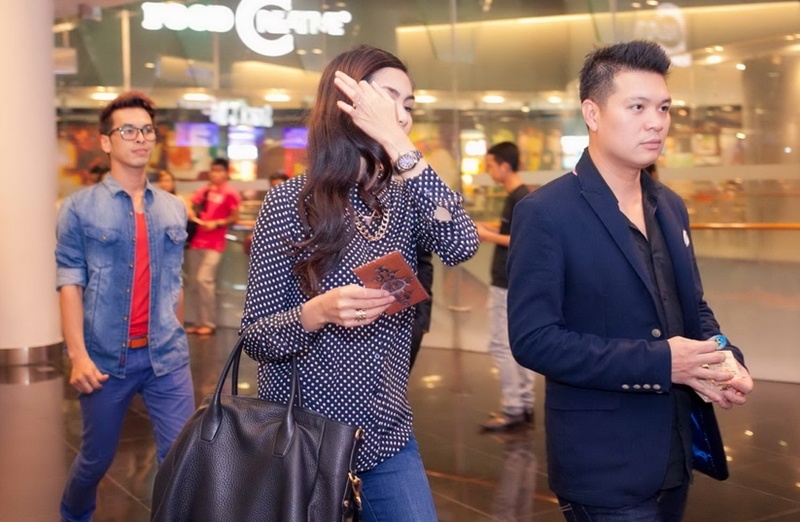 Vừa trở về sau chuyến "ở ẩn" cùng gia đình, "ngọc nữ" của điện ảnh Việt đã đến xem suất chiếu ra mắt đầu tiên của bộ phim điện ảnh Lửa Phật diễn ra đêm qua (19/8). Không đồng hành cùng ông xã Loius như thường lệ, cô đi cùng em chồng Phillips và bạn thân là stylist Quang Tuyến.