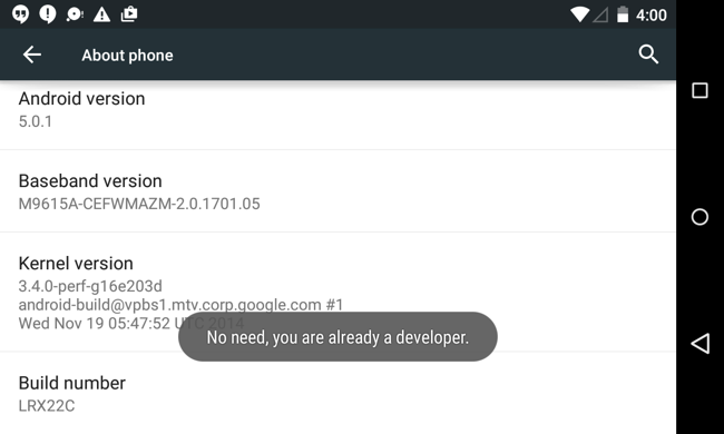 Đầu tiên, bạn cần kích hoạt menu Developer Options bằng cách mở Settings, cuộn xuống cuối cùng, chọn About phone/About tablet rồi bấm vào “Build number” vài lần. Bạn sẽ thấy thông báo cho biết bạn đã là lập trình viên.