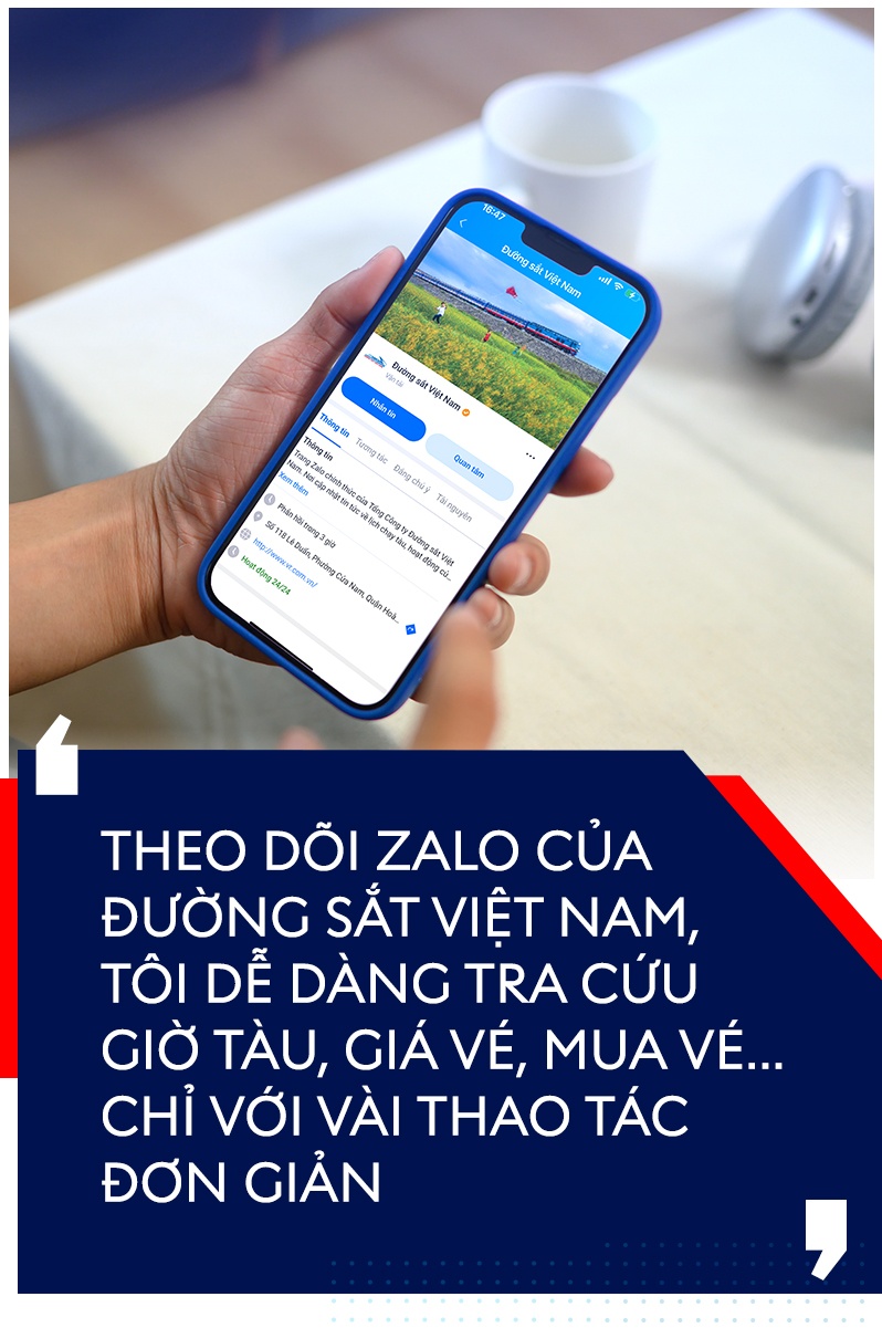 “Tôi đọc báo thấy không ít trường hợp người lớn tuổi bị lừa mua phải vé tàu, xe giả mà đến sát giờ đi mới phát hiện. Tôi cũng không muốn bố mẹ phải tự ra ga mua vé vào đợt lễ cao điểm. Trước đây, tôi thường đặt vé qua website, nhưng mới biết cách mua qua Zalo tiện lợi hơn nhiều. Chỉ cần theo dõi trang Zalo của Đường sắt Việt Nam, tôi có thể dễ dàng tra cứu giờ tàu, giá vé, mua vé... thậm chí gửi xe và hành lý nếu cần chỉ với vài thao tác đơn giản”, anh Minh chia sẻ.