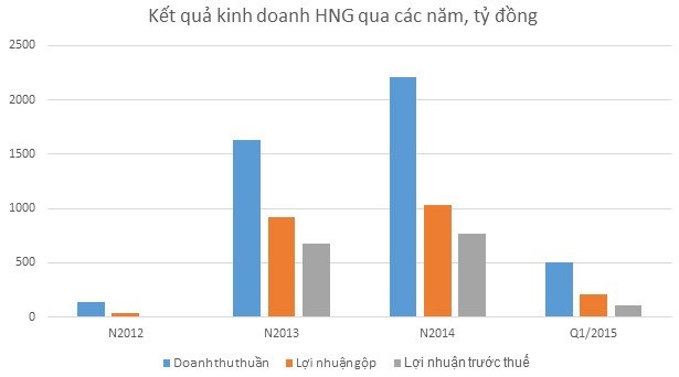 Theo báo cáo tài chính trong các năm gần đây, hoạt động sản xuất kinh doanh của HNG đạt tốc độ tăng trưởng cao. Nếu doanh thu và lợi nhuận sau thuế năm 2012 của HNG mới chỉ là 133,5 tỷ đồng và 2,8 tỷ đồng thì sang năm 2013, những con số này lần lượt tăng lên 1.630,28 tỷ đồng và 602,76 tỷ đồng.