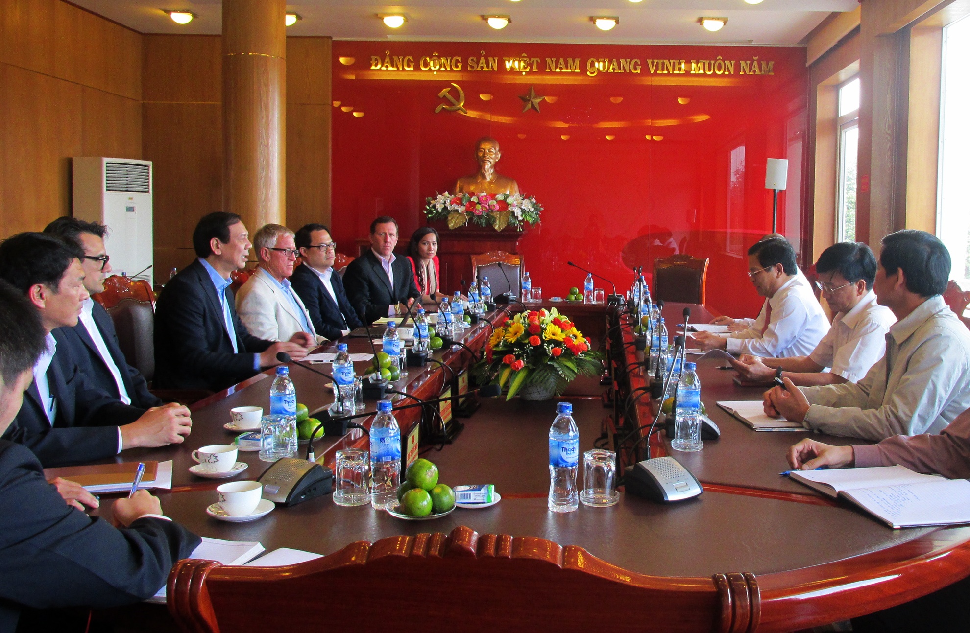 | Lãnh đạo Tập đoàn JK & D International, Ltd(Mỹ) làm việc với lãnh đạo chủ chốt tỉnh Quảng Ngãi chiều 3/3. Ảnh: Minh Hoàng. |