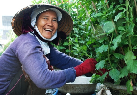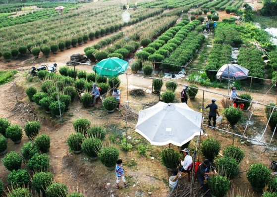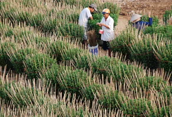 | Những phụ nữ trên đồng cúc. Công việc dặm hoa, chỉnh sửa chậu hoa đòi hỏi sự khéo léo, tỉ mẩn, rất hợp với chị em. Vườn cúc vào vụ Tết là thời điểm mà các nhà vườn thuê lượng lớn nhân công làm việc theo ngày. |