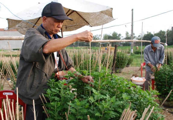 | Trung tuần tháng 11 âm lịch, cúc đơm nụ, các nhà vườn dặm cây con, cắm cọc tre sửa cây để chậu cúc đầy đặn, chỉnh sửa hoàn thiện, để cây phát triển và nở hoa đúng Tết. |