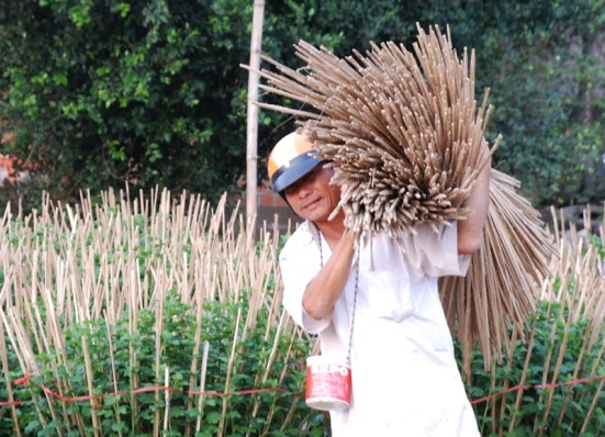 | Tre được vót thành những cọc nhỏ, cắm quanh chậu cúc để giữ cho cúc thẳng, không bị gãy cành. Việc cắm tre được làm hoàn toàn thủ công. |