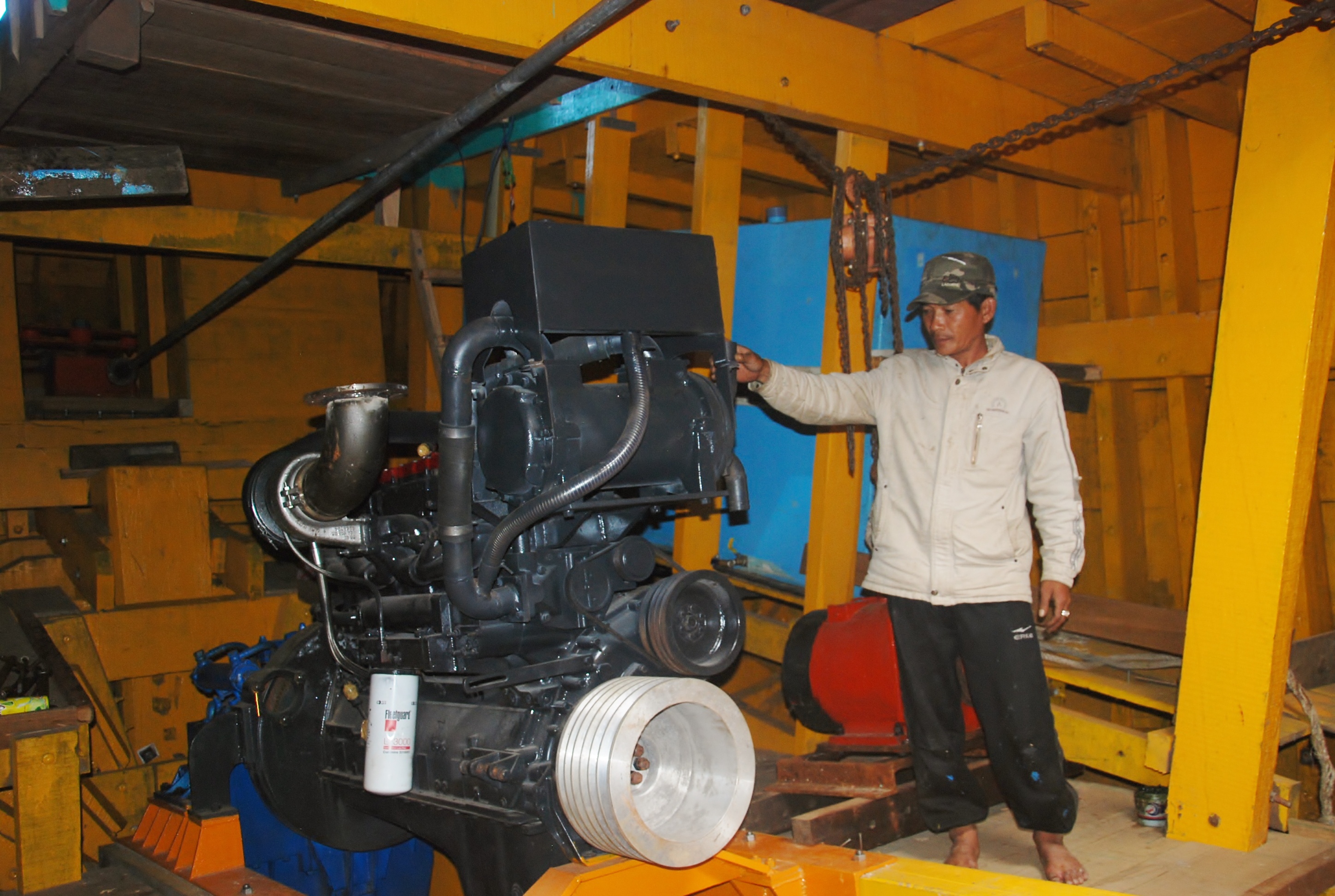 | Ông Vốn đã đầu tư gần 2 tỷ đồng mua 118 m3gỗ sến để đóng thân tàu. Ông cho biết loại gỗ này rất chắc nên có thể hạn chế sự hư hỏng nếu bị tấn công trực diện. |