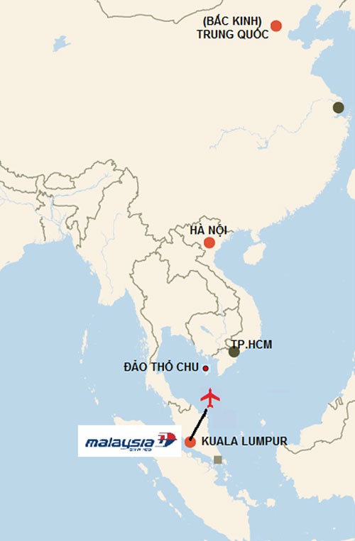 Một quan chức cấp cao của Bộ Giao thông Vận tải cho Zing.vn biết, theo kế hoạch, máy bay Boeing 777-200 của Malaysia vào không phận TP.HCM vào lúc 17h22 giờ GMT nhưng chưa đến nơi thì mất tín hiệu. Cà Mau là vùng gần nhất trước thời điểm máy bay phát tín hiệu lần cuối.