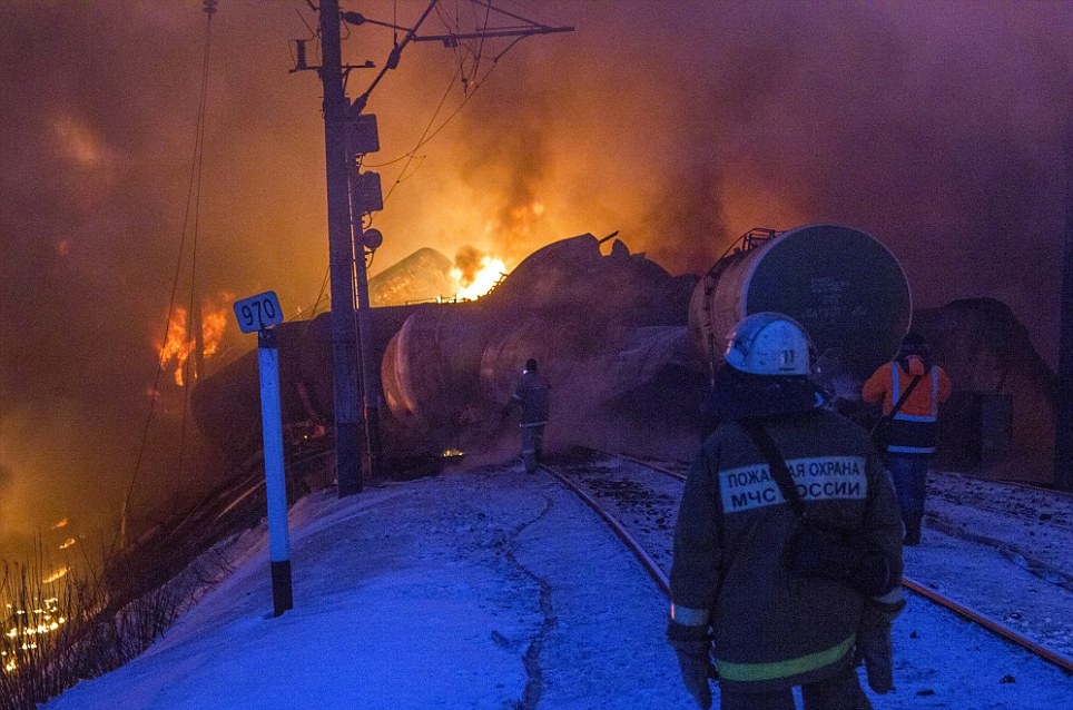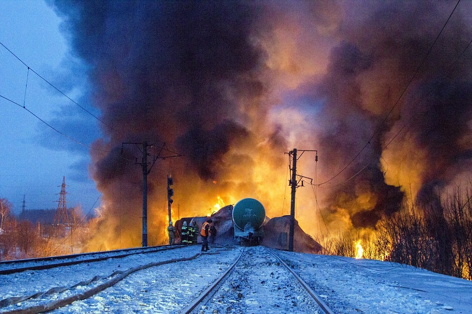 Giới chức Nga xác nhận, đoàn tàu chở khí hóa lỏng bắt lửa do đường dây điện phía trên nó gặp sự cố. Những toa tàu phát nổ, tạo thành quả cầu lửa khổng lồ bao trùm đường ray. Không ai bị thương trong vụ tai nạn nhưng người ta đã sơ tán khoảng 700 người vì lo ngại khí độc từ đám cháy. Ảnh: Daily Mail.