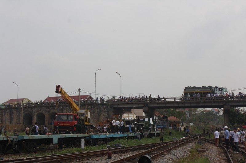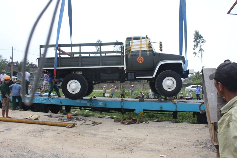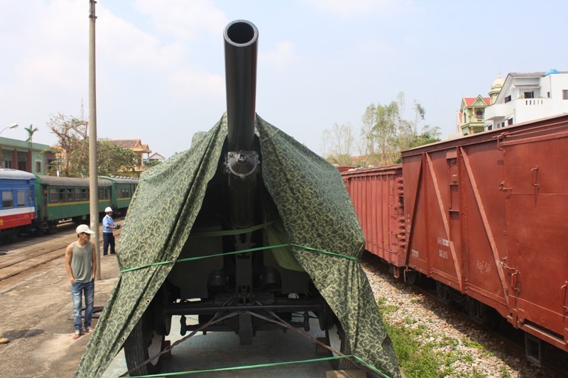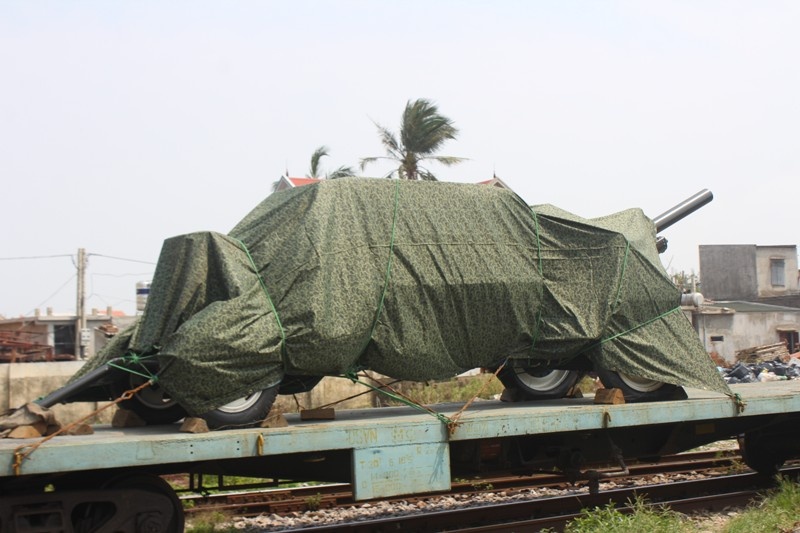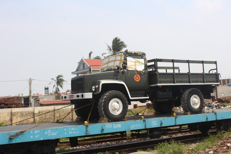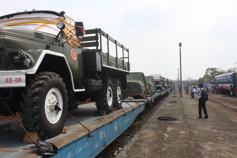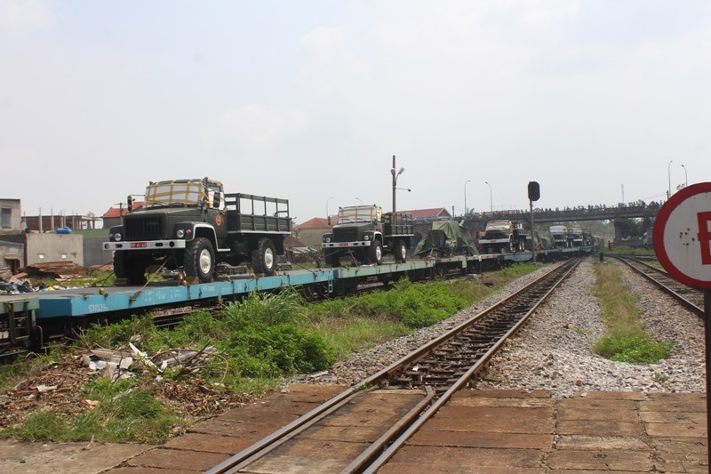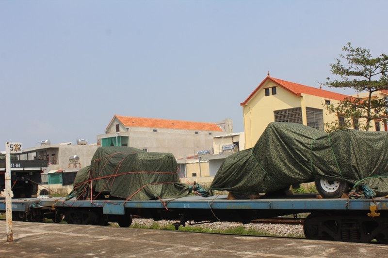 | Đoàn tàu đang tiến vào sân ga. Trên tàu chở 11 xe tiêu binh, 1 khẩu pháo lựu 105 và hai chiếc xe U oát |