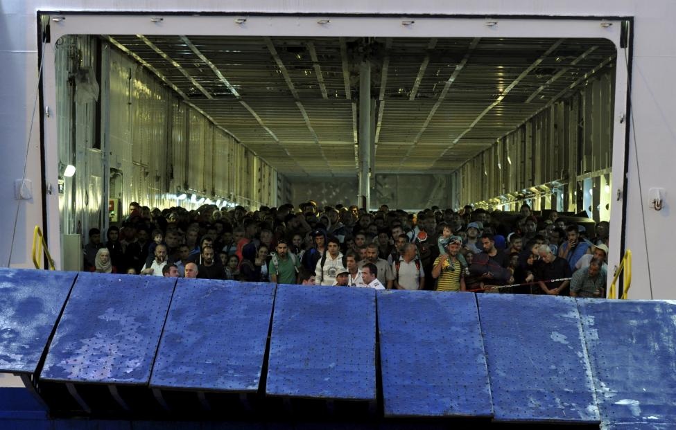 Người di cư Syria chen chân trên một chuyến tàu chở khách ở cảng Piraeus, gần Athens, Hy Lạp, hôm 15/9. Họ đang trên hành trình tìm cuộc sống mới tốt đẹp hơn ở các nước châu Âu. |