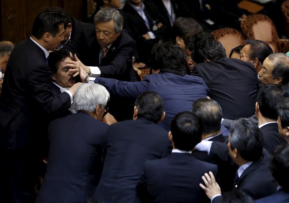 Các nhà lập pháp vây quanh Masahisa Sato, Phó Chủ tịch Ủy ban Đặc biệt về An ninh của Thượng viện Nhật Bản, khi bỏ phiếu thông qua dự luật an ninh lịch sử hôm 17/9. Dự luật mới cho phép Tokyo đưa Lực lượng Phòng vệ ra ngoài lãnh thổ để bảo vệ các đồng minh. |