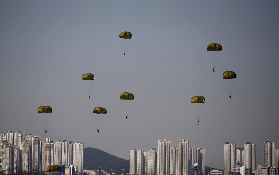 Lính đặc nhiệm Hải quân Hàn Quốc nhảy dù trong lễ kỷ niệm 65 năm Chiến dịch Đổ bộ Incheon trong Chiến tranh Liên Triều năm 1950 – 1953. |