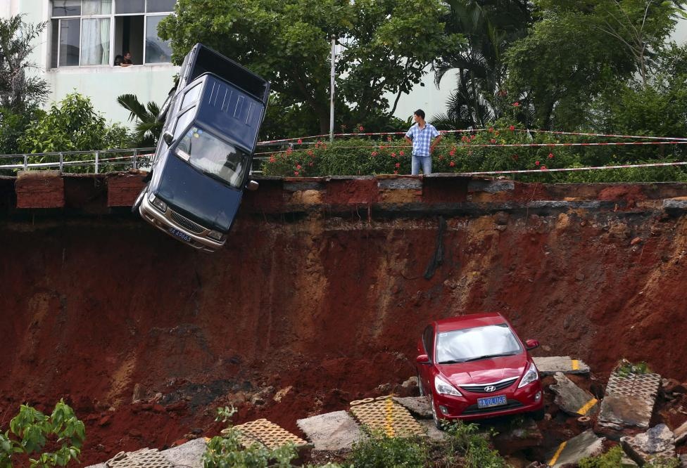 Người đàn ông nhìn chiếc xe bị "hố tử thần" nuốt chửng hôm 16/9. Trận mưa lớn kéo dài gây sụt lún trong một bãi đậu xe ở tỉnh Hải Nam, Trung Quốc. |