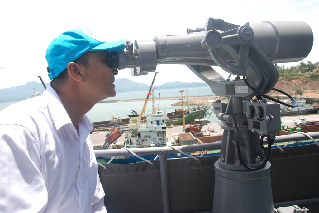 Một vị khách tham quan đang sử dụng thử ống nhòm trên tàu.