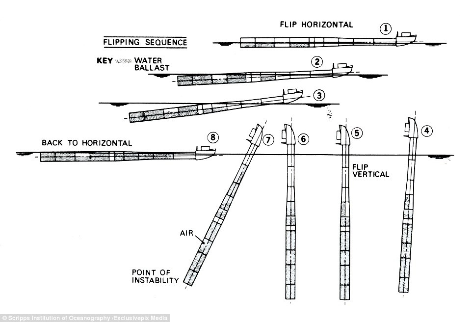 Sau khoảng 20 phút, tàu nổi của ONR sẽ giữ nguyên tư thế thẳng đứng như một trạm nghiên cứu giữa biển để chuyên gia tiến hành các thí nghiệm.