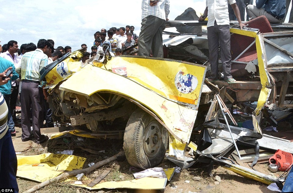 | Hầu hết học sinh gặp nạn đang ở độ tuổi từ 7 đến 14 và đang tới trường bằng xe buýt, Hindustan Times đưa tin . Tàu hỏa đã kéo lê chiếc xe một đoạn gần 100 m. Ảnh: Daily Mail |