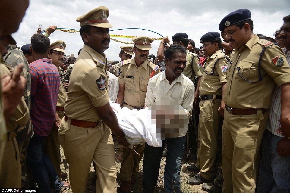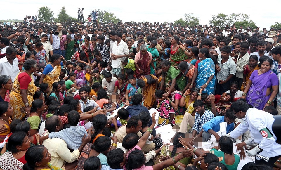 | Hàng trăm người dân đổ về hiện trường vụ va chạm tại quận Medak thuộc bang Andhra Pradesh. Ông T Harish Rao, một quan chức Ấn Độ, cho biết bố của hai đứa trẻ thiệt mạng trong tai nạn, không chịu nổi cú sốc lớn đã qua đời vì đột quỵ. Ảnh: AP |