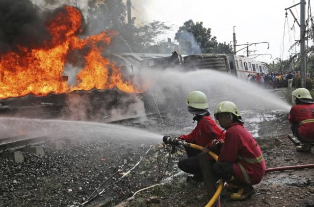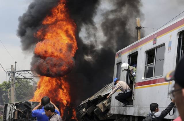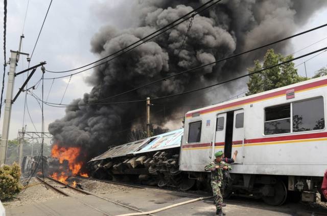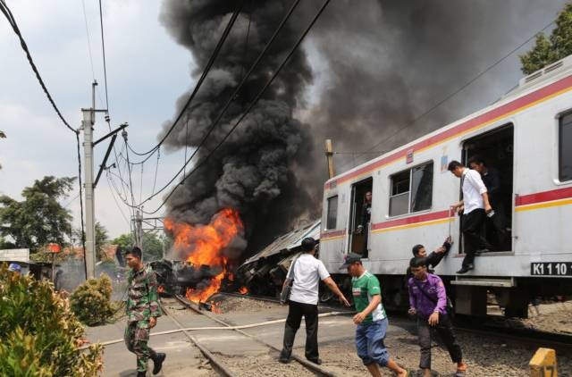 AFP đưa tin cú va chạm khiến xe téc chở dầu và đầu tàu hỏa bốc cháy dữ dội. Người phát ngôn Bộ Giao thông vận tải, ông Bambang Ervan, xác nhận người lái tàu nằm trong số những nạn nhân thiệt mạng. Ảnh: Gulfnews.