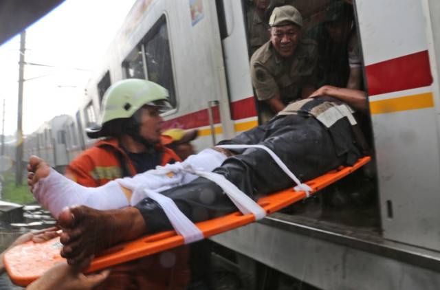 Ông Sukendar Mulya, phát ngôn viên công ty xe lửa quốc doanh Kereta Api Indonesia, cho biết: “Xe cấp cứu đưa các hành khách bị thương tới bệnh viện. Chúng tôi đang phối hợp với cảnh sát và các bên liên quan để sơ tán người dân chịu ảnh hưởng của vụ tai nạn”. Ảnh: Gulfnews.