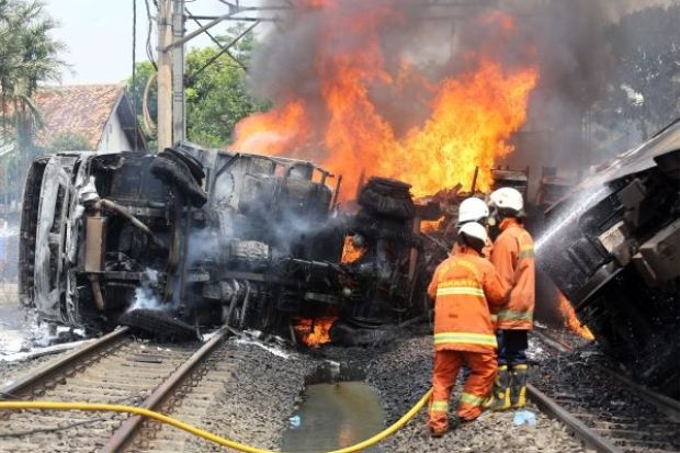 Chiếc xe chở dầu thuộc sở hữu của công ty quốc danh Pertamina. Những người chứng kiến vụ tai nạn cho biết, chiếc xe tải cố tăng tốc vượt qua điểm giao cắt khi rào chắn hạ xuống. Đúng lúc đó, đoàn tàu lao tới khiến tài xế không kịp trở tay. Ảnh: Gulfnews.