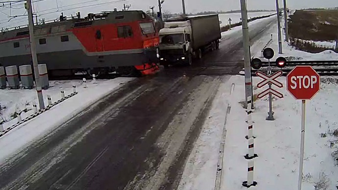 | Chiếc xe tải trượt lái, lao vào đường ray giữa lúc hai tàu đang lao tới, gây ra tai nạn hôm 22/11. Ảnh: Youtube |