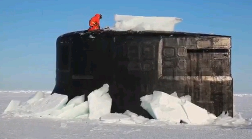 Từ bên dưới lớp băng dày, tàu ngầm hạt nhân USS Connecticut của Mỹ nhẹ nhàng ngoi lên trong một đợt huấn luyện tác chiến mùa đông.