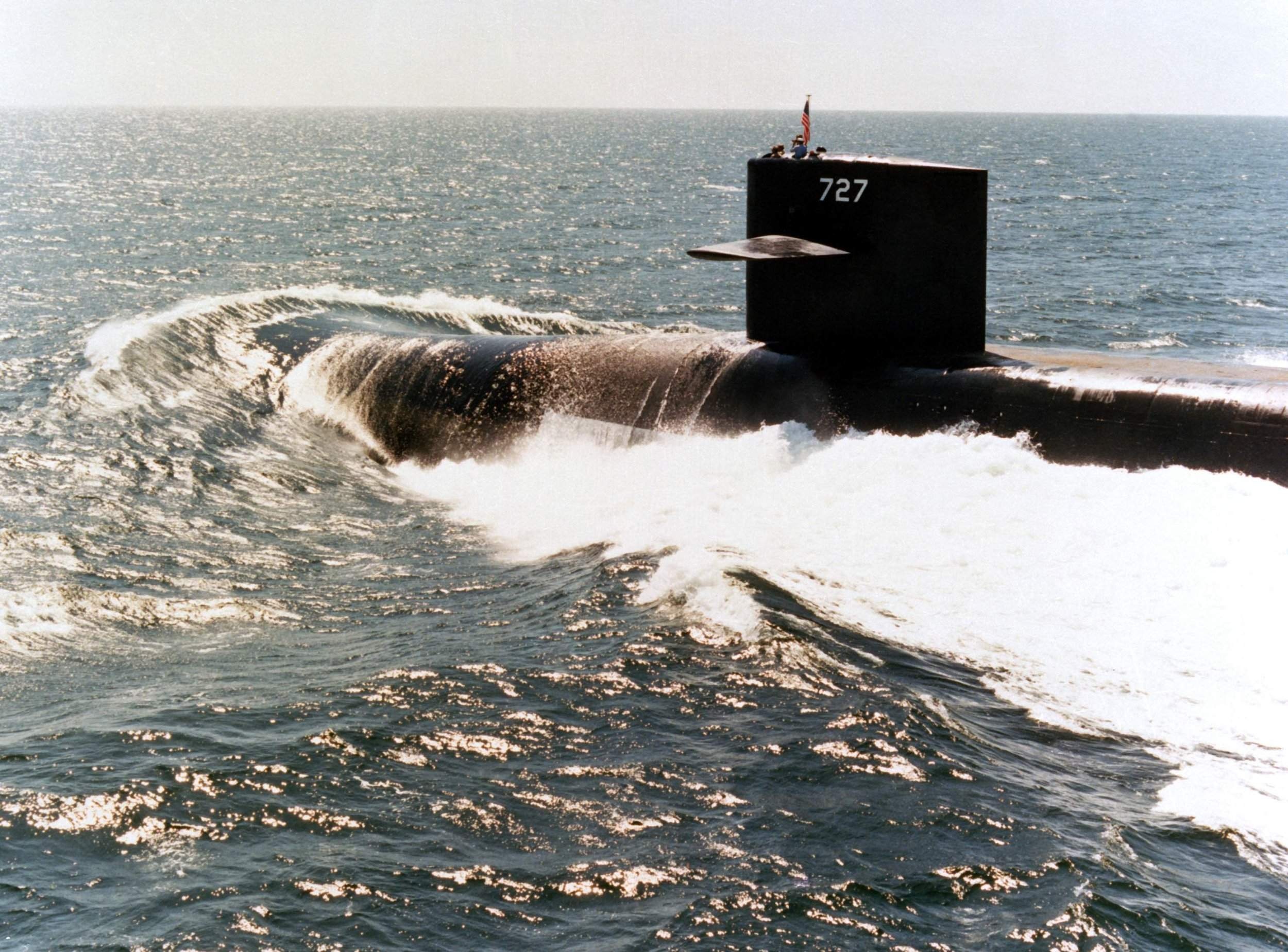USS Greeneville (SSN-772), tàu ngầm khác thuộc lớp Los Angeles, rẽ sóng trên biển. Nó cõng trên lưng một tàu ngầm nhỏ hơn để phục vụ các nhiệm vụ tối mật của lực lượng Biệt kích Hải quân Mỹ. |