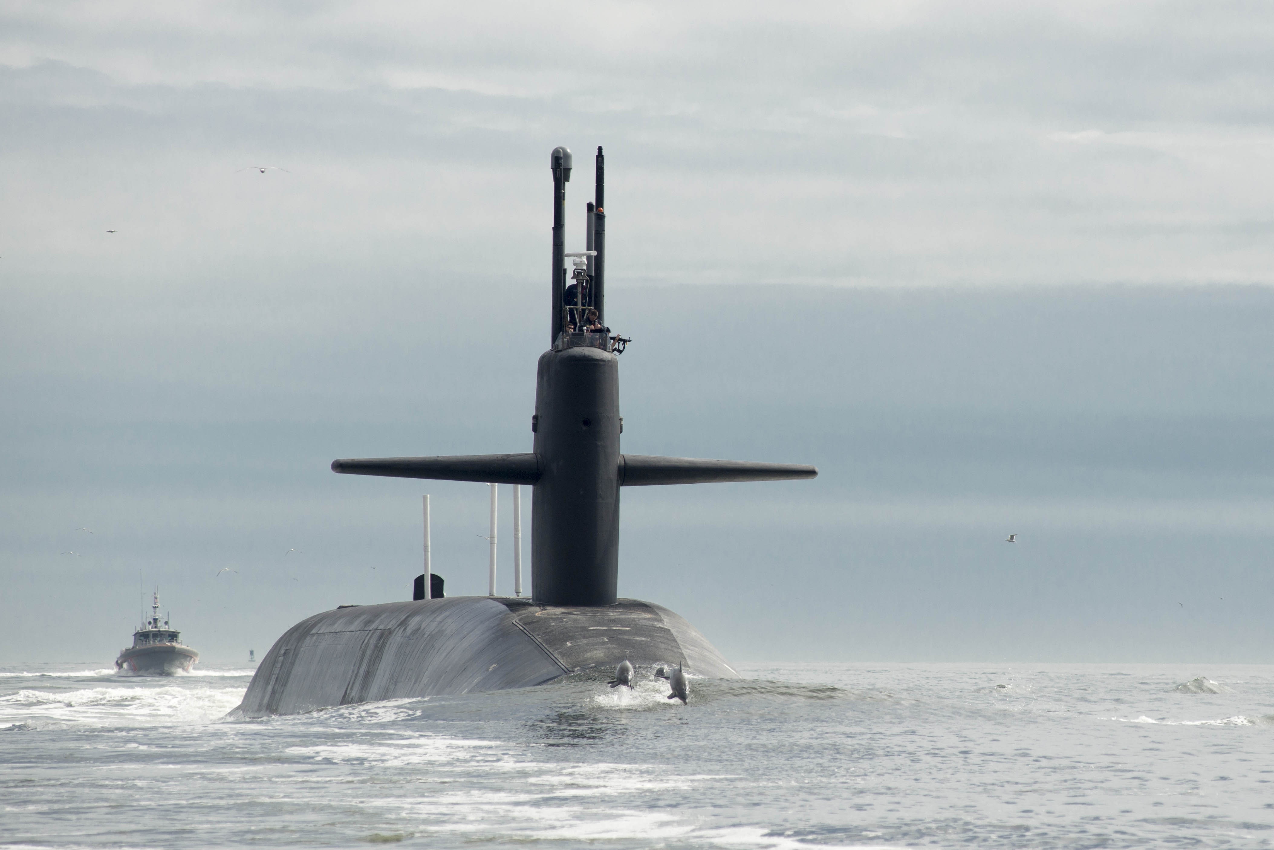 Tàu ngầm hạt USS Ohio (SSGN-726) nổi trên mặt nước trong chuyến hành trình tháng 11/2008. Nó là tàu đầu tiên thuộc lớp tàu ngầm hạt nhân trang bị tên lửa đạn đạo cùng tên của Hải quân Mỹ. Chúng dài 170 m, rộng 13 m với tải trọng choán nước đạt 18.450 tấn. Các tàu lớp này được trang bị 1 lò phản ứng hạt nhân S8G PWR, cho phép tàu di chuyển với tốc độ 22 km/h khi nổi và 37 km/h khi lặn. |