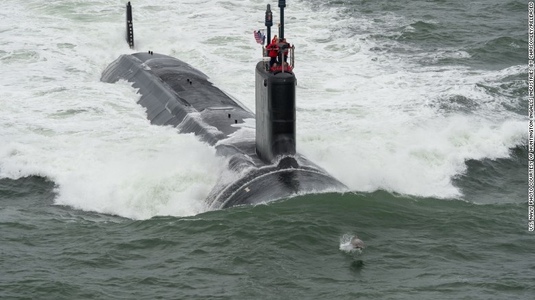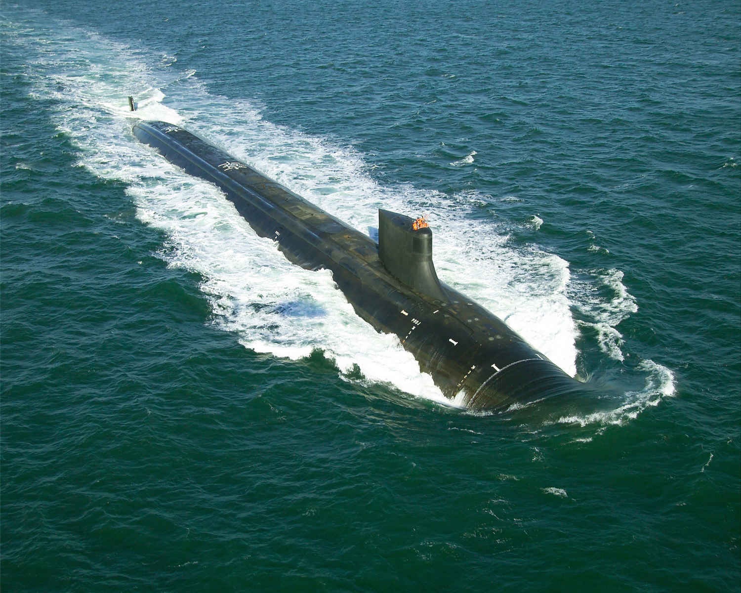 Cá heo bơi trước mũi tàu ngầm USS John Warner (SSN-785) đang rẽ sóng. Đây là tàu ngầm tấn công nhanh chạy nhiên liệu hạt nhân thuộc lớp Virginia. Chúng dài 115 m, rộng 10 m và có tải trọng choán nước 7.800 tấn. Lò phản ứng S9G cho phép tàu di chuyển với vận tốc tôi đa đạt 65 km/h và hoạt động liên tục trong khoảng 20 năm mà không cần tiếp nhiên liệu. Tàu được trang bị tên lửa hành trình Tomahawk để tấn công các mục tiêu trong đất liền. |