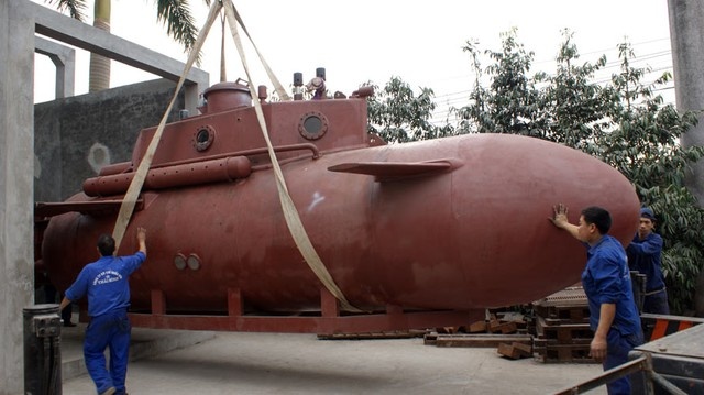 | “Sau khi đã vào trong bể nước hoàn toàn, công đoạn cuối cùng của những người thợ sẽ là lấp kín cửa vào của bể nước và sau đó thử nghiệm tàu trong môi trường nước. Mục đích của việc thử nghiệm dưới nước này là kiểm tra khả năng hoạt động của con tàu trong môi trường nước”, ông Hòa cho biết thêm. |