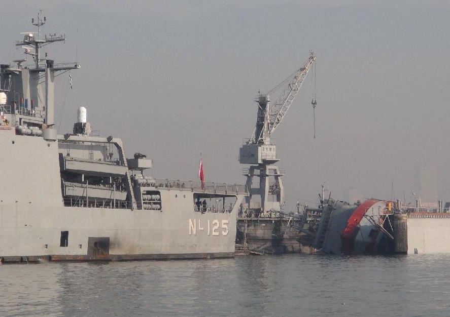 | Con tàu gặp nạn trong quá trình bảo trì tại Nhà máy đóng tàu hải quân Alaybey, huyện Karsiyaka tỉnh Izmir, phía tây Thổ Nhĩ Kỳ. Ảnh: Tân Hoa Xã. |
